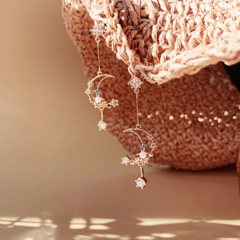 Aretes de Luna y Estrellas con Perlas Celestiales en Oro